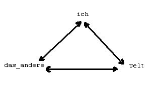 Diese relationen sind in der weise miteinander verknüpft, dass immer zwei der drei momente: ich, welt, das-andere, eine relation im blick auf das ausgeschlossene dritte moment konstituieren.
