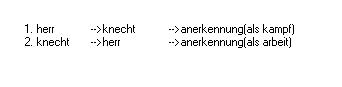 Die traditionelle unterscheidung von herr und knecht, in der realität sind das soziale rangstufen, die die arbeit des ich nach befehl und gehorsam unterscheiden, modifiziert Hegel, indem er dem begriff: anerkennung, mit zwei disparaten merkmalen definiert, und das merkmal: kampf(in der form des befehls), dem herrn, das merkmal: arbeit, dem knecht zuordnet. Was Hegel im begriff: anerkennung des anderen als der_andere, als einheit denkt, das erscheint bei ihm in der realität als gedoppelt in zwei phänomenen, die in ihrer struktur nicht gleich sind. Die doppelung der anerkennung als arbeit und als kampf ist phänomenal ein gegensatz, begrifflich aber ein widerspruch, der den begriff der anerkennung zur unterscheidung von herrn und knecht in der von Hegel intendierten zielsetzung logisch ausschliesst. Der begriff: kampf, zielt in seiner begrifflichen konsequenz immer auf die vernichtung des anderen als der_andere ab; der begriff: arbeit, ist nur in der kooperation mit dem anderen als der_andere sinnvoll. (*abs.:007*)