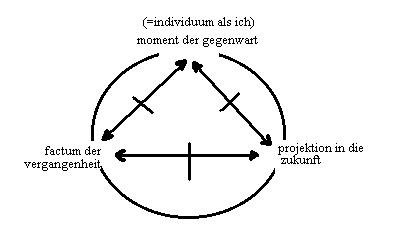 Jedes ding der welt ist für sich das, was es ist - eine tautologische aussage, die das individuum als ich in seiner raumzeiterfahrung mit sinn anfüllt. Das trialektische modell der raumzeiterfahrung(08) operiert mit den traditionellen formen der zeit: "gegenwart, vergangenheit und zukunft", ordnet diese aber nicht auf einem zeitpfeil an, der aus der vergangenheit kommend in der gegenwart real ist und in der zukunft wieder verschwindet, sondern fundiert die raumzeiterfahrung des individuums als ich in der unmittelbar gelebten gegenwart, in der das individuum als ich die facta der vergangenheit erinnert und die projektionen in die zukunft imaginiert. Der vermittlungspunkt ist die gelebte gegenwart, das unmittelbare hier und jetzt, in dem das individuum als ich bei sich selbst ist. In dieser gelebten gegenwart erinnert das individuum als ich die facta der vergangenheit und imaginiert es die projektionen in die zukunft. Für das individuum als ich sind die erinnerungen und imaginationen real; ausserhalb dieser erinnerungen und imaginationen des individuums als ich sind die facta der vergangenheit und die projektionen in die zukunft für das individuum als ich keine dinge seiner welt - was sie sonst noch sein mögen, das ist für es irrelevant. Die unmittelbar gelebte gegenwart des individuums als ich und das individuum als ich sind identisch; folglich sind drei relationen möglich, mit denen das individuum als ich die momente der zeit: "gegenwart(=das_individuum_als_ich), das factum der vergangenheit und die projektion in die zukunft" miteinander verknüpft: