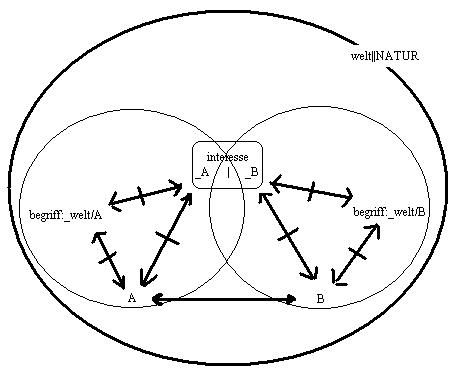Das interesse an dem mit sich identischen ding der welt: k, erscheint einmal als das interesse des individuums als ich: A, und als das interesse des genossen: B, das unter den zeichen: interesse_A|_B, in einem kasten zusammengefasst ist(a). Das jeweils dritte moment zu den relationen: interesse:_A<==|==>A und interesse:_B<==|==>B, ist der begriff: welt, den das individuum als ich: A, und sein genosse: B, jeder für sich, denken. Diese begriffe sind als begriffe logisch nicht vereinbar, als phänomene aber können sie gleich oder nicht_gleich erscheinen. Die beiden schemata sind mit einem kreis gekennzeichnet.