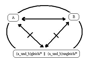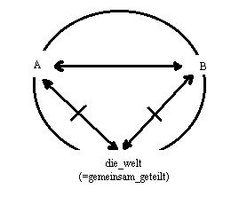 das individuum als ich: A, und sein genosse: B, werden nur mit den buchstaben: A und B, bezeichnet; ebenso der beobachtende dritte: C, mit dem buchstaben: C. (a)<==//(b)die graphische darstellung ist auf die analyse beschränkt. Die synthetisierenden folgerungen, die mit dem analytischen resultat verknüpft werden können, sollen ausser betracht bleiben. Welchen nutzen die resultate der analyse haben sollen, das muss der adressat für sich beurteilen. (b)<==//(c)die formel der relationen: A<==|==>(A<==>B) und B<==|==>(B<==>A). (c)<==//(d)das moment: die_welt, wird mit dem zeichen: die_welt(=gemeinsam_geteilt), bezeichnet. Der gebrauch des zeichens ist auf dieses argument beschränkt. (d)<==//-------------