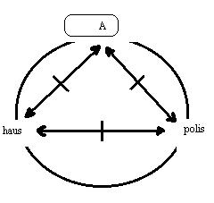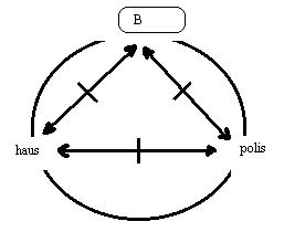 im politischen diskurs ist es üblich mit dem schema: 1, zu argumentieren, eine allgemeine verbindlichkeit ausgebeutend, die faktisch nicht gegeben ist. Wenn zwei sich über diesselbe sache streiten, dann ist die erfahrung geläufig, dass dasselbe objekt der gegenstand des disputs ist, präsent in zwei unterschiedlichen sichtweisen. Das ist, wie man sagt, eine binsenweisheit, die aber immer dann vergessen oder ignoriert wird, wenn einem bestimmten interesse der vorrang eingeräumt sein soll. Die bestimmtheit der relation: haus<==|==>polis, ist im horizont des ausgeschlossenen dritten moments festgelegt und dieses dritte moment ist eine relation, die einerseits exakt definiert ist, die aber andererseits immer zwei perspektiven präsent hält, die perspektiven des individuums als ich: A, und die perspektive des genossen: B, perspektiven, die auf das ding der welt, die relation: haus<==|==>polis, ausgerichtet ist, das, für sich mit sich identisch, in den zwei möglichen perspektiven verschieden erscheint.