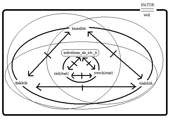 Der in dicker linie gezogene kreis, unterbrochen mit dem zeichen: welt||NATUR, markiert die grenze, die die welt, geteilt vom individuum als ich und seinem genossen, von dem trennt, was Ich mit dem zeichen: NATUR, bezeichne.