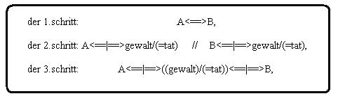 (a)lies: grooss A relationiert abhängig die gewalt schrägstrich in klammer gleich tat, die gewalt schrägstrich in klammer gleich tat relationiert abhängig grooss B.(b)es mag sein, dass das wiedererscheinen der wechselseitigen relation: A<==>B, verwunderung auslöst, weil der eindruck entstanden sein könnte, dass die gewalt/(=tat) nachrangig geworden sei. Das ist aber eine falsche interpretation. Manifeste gewalt kann die wechselseitige relation zerstört haben, weil das gewaltanwendende individuum als ich: A, oder der genosse: B, oder beide aus unterscheidbaren motiven gewalt üben und sich damit als ich selbst entmächtigt haben. Aus der perspektive des beobachtenden dritten: D, muss aber weiter behauptet werden, dass A und B ein ich sind und damit zueinander in einer wechselseitigen relation stehen(01). Der beobachtende dritte: D, selbst ein ich, muss, wenn er sich als ich begreifen will, voraussetzen, dass sowohl A als auch B, zu denen er eine wechselseitige relation hat, ein ich sind, auch dann, wenn der eine oder der andere oder beide gegeneinander gewalt üben(02).----------------