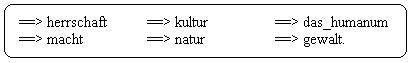 es ist tradition, die herrschaft mit der kultur(a) und dienatur(b) mit der macht gleichzusetzen, aber das, was prima vista plausibel ist, das ist secunda vista falsch. Zu unterscheiden sind einerseits die relationsbegriffe: natur/kultur, andererseits die relationsbegriffe: herrschaft/macht, begriffe, die nicht al gusto miteinander kombiniert werden können, weil die relationsbegriffe: herrschaft und macht, im begriff: natur, keine konstitutiven merkmale sein können, und die einschlägigen ereignisse in der natur sind als phänomene immer durch die kultur vermittelte dinge der welt. Die relationsbegriffe: macht und herrschaft, können nur in der perspektive des begriffs: kultur, reflektiert werden und in dieser perspektive haben die begriffe unterscheidbare funktionen, die zu phänomenen führen, die in ihrer gegensätzlichkeit sich ausschliessen. Der begriff: herrschaft, ist, vermittelt durch den begriff: kultur, positiv mit dem begriff: das_humanum, konnotiert, der begriff: macht, wird, wenn er durch den begriff: natur, vermittelt werden soll, negativ mit dem begriff: gewalt, verknüpft(c). Das resultat können plausible argumentationsketten sein(d), die partiell gültig sind, niemals aber das ganze umfassen können(e).2.52.16