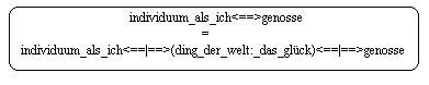 (*1)es ist ein irrtum, wenn der sogenannte reiche meint, er könne im ausleben seines reichtums als formen des glückes den armen vergessen - er kann in seinem bewusstsein den armen verdrängen, aber nicht auslöschen. (d/01)<==//der gedanke in einer graphik wiederholt. Die wechselseitige relation zwischen dem individuum als ich und seinem genossen ist auch dann real, wenn in der vermittlung durch das glück des einen oder des anderen das ding der welt: das glück, von beiden mit abhängigen relationen erfasst wird. Die relation: individuum_als_ich<==>genosse, ist äquivalent mit der relation: individuum_als_ich<==|==>(ding_der_welt:_das_glück)<==|==>genosse,(*1).(03)
