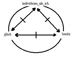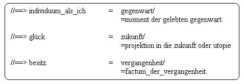 (01)Historische Wörterbuch der Philosophie: stichwort: glück, glückseligkeit. Bd.3, sp.679-707(Robert Spaemann). /bibliographie //==>2.93.48.(02)Richter,Ulrich: Die begriffe: eigentum und besitz, im trialektischen modus. 016:eigentum. /bibliographie //==>2.93.49. (g)<==//die wiederholung des gedankens in einer graphik. Die einbindung des gedankens ist klarer fassbar, wenn die beziehungen zwischen den momenten: "das individuum als ich, sein glück und der besitz desselben" in einer graphik gefasst werden. Das zugrundeliegende argument ist die zeiterfahrung im trialektischen modus(01). Im moment: gegenwart, ist immer das individuum als ich einzusetzen. Im moment: zukunft, können die momente: "projektion in die zukunft, oder glück, oder utopie" eingesetzt werden und im moment: vergangenheit, die momente: factum der vergangenheit und besitz(02).(i)