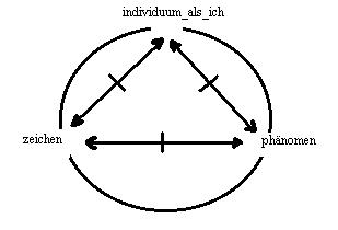 Die drei relationen werden mittels der einsetzungsregel mit dem modell des semiotischen dreiecks verknüpft. Im schema des semiotischen dreiecks: "begriff, phänomen und zeichen" kann das individuum als ich entweder in der systemstelle: zeichen, oder in der systemstelle: begriff, oder in der systemstelle: phänomen, eingesetzt werden. Damit ergeben sich parallel drei modelle, die in ihrer funktion gleich sind, aber als phänomene in keinem fall identisch sein können(c). Wenn das individuum als ich mit den dingen der welt in ihren funktionen, ein zeichen, ein begriff oder ein phänomen zu sein, operiert, dann hat es immer zwei momente in zwei relationen präsent, von denen das eine moment als das ausgeschlossene dritte moment die funktion des horizonts hat(d). Die einbeziehung des individuums als ich markiert, dass der quellgrund jeder aussage über die begriffe, die zeichen und die phänomene das individuum als ich ist. Für sich sind die begriffe, die phänomene und die zeichen, im jargon der tradition gesprochen, nichts, aber im blick des individuums als ich erscheinen die begriffe, die phänomene und die zeichen als belebt, ein blick, mit dem das individuum als ich zwei momente umfasst; das dritte moment ist das individuum als ich selbst.