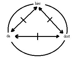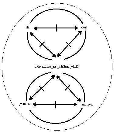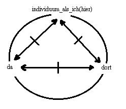Der raumpunkt: hier, ein ding der welt, wird von dem ding der welt: das individuum als ich, besetzt. Das individuum als ich und der raumpunkt: hier, fallen identisch. Wird die identität verneint, dann kann der raumpunkt: hier, entweder nur der raumpunkt: da, oder der raumpunkt: dort, sein.