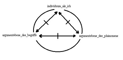 im moment der gelebten gegenwart hat das individuum als ich entweder die erste relation oder die zweite relation präsent - tertium non datur(1). Wer aus der funktionsstelle: zeichen,(2) in der perspektive des individuums als ich über das phänomen argumentiert, der setzt zwar den begriff voraus, mit dem er seinen gegenstand als diesen identifiziert, aber er sagt nichts über den begriff; ebenso kann aus der funktionsstelle: zeichen, in der perspektive des individuums als ich über den begriff argumentiert werden, aber dieses argument setzt voraus, dass es einen korrespondierendes phänomen geben muss, über das im argument nichts prädiziert werden kann. Die verknüpfung der beiden momente: begriff und phänomen, in einem akt des denkens oder der wahrnehmung kann in raum und zeit auch ein gegenstand des beobachtenden genossen sein. Die unterscheidbaren perspektiven sind aber analytisch strikt auseinanderzuhalten, wenn sie als argumente in einem diskurs erscheinen, in dem alle, die es betrifft, das analytisch getrennte synthetisierend instrumentalisieren.