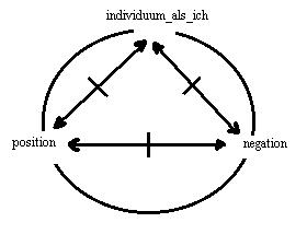 Zusatz: in der kommunikation des individuums als ich: A, mit dem genossen: B, über das ding der welt: k, erscheint die wechselseitige relation: A<==>B, mit den abhängigen relationen: A<==|==>k und k<==|==>B, relationen, die im ding der welt: k, als dem ausgeschlossenen dritten moment ihr verknüpfendes moment haben. Als horizont in der wechselseitigen relation: A<==>B, erscheint diese verknüpfung transformiert in der abhängigen relation: A<==|==>k'<==|==>B, deren vermittelndes moment: k', nicht mit dem ding der welt: k, identisch ist. Es ist also eine frage der perspektive, ob in der situation der kommunikation die wechselseitige relation** fokussiert werden soll oder die abhängige***. Die differenz ist nicht aufhebbar****.