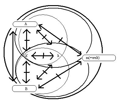 wiederholung des gedankens in einer graphik. In der kommunikation des A und B über das mit sich identische ding der welt: k, ist das mit sich identische ding der welt: k, in den vorstellungen des A und des B zwar gleich, aber nicht identisch; es sind unterscheidbare vorstellungen des A und B, die der intention nach zwar identisch sein sollen aber nur gleich sein können. Das schema der anmerkung: (b/3), ist folglich noch einmal zu modifizieren, weil in den vorstellungen des A und des B zwei getrennte schemata vorliegen, die in dem ding der welt: m(=welt), als dem ausgeschlossenen dritten moment ihr verknüpfung haben. Es ist eine frage der perspektive, welche schemata akzentuiert werden, die übereinander geblendet erscheinen, aber nicht identisch sein können.