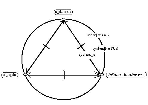 (1) wiederholung des gedankens in einer graphik. Die konstitutiven momente des begriffs: system, sind: "n_elemente, n'_regeln, differenz:_innen/aussen". Die relationen: