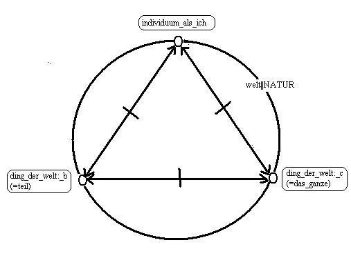 wiederholung des gedankens in einer graphik. Die konstitutiven momente des begriffs: welt, sind: "individuum_als_ich, ding_der_welt:_b(=teil) und ding_der_welt:_c(=das_ganze). Die relationen:
