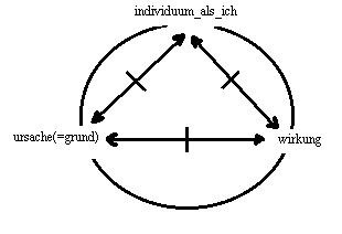 es ist eine frage der perspektive, ob zuerst die ursache gesetzt sein muss, um zu einer wirkung fortzuschreiten, oder ob erst eine wirkung behauptet werden muss, um auf die ursache zurückschliessen zu können. Für das individuum als ich erscheint der zusammenhang von ursache und wirkung in der relation(3): ursache(=grund)<==|==>wirkung, für die das individuum als ich das ausgeschlossene dritte moment ist; denn was das individuum als ich in der relation als ursache oder als wirkung ansieht, das hat es in der relation(1): individuum_als_ich<==|==>ursache(=grund), und in der relation(2): individuum_als_ich<==|==>wirkung, gesetzt(1).