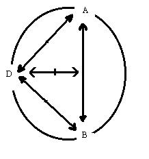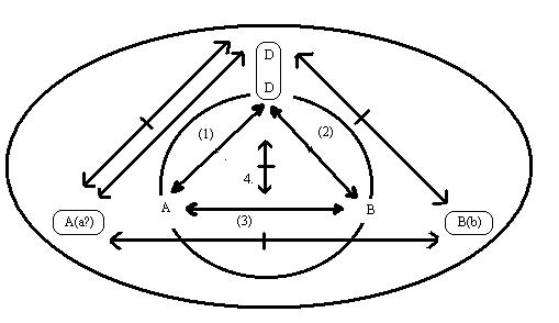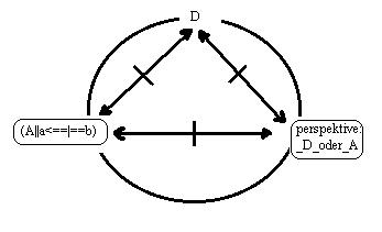 wiederholung des gedankens in einer graphik. Die situation ist verändert, wenn der beobachtende dritte: D, nach der tat des A die dritte relation: A||a<==|==>b, zum moment seiner relation(1) hat und als das dritte moment seine perspektive oder die perspektive des A setzt, die D hypothetisch fassen kann. Das sind zwei unterscheidbare schemata, die strikt getrennt werden sollten.