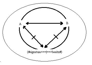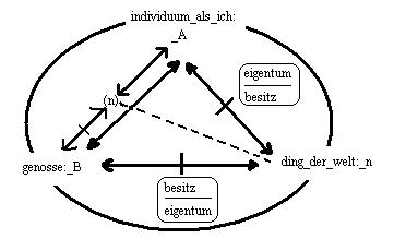 das problem ist die gedoppelte kodierung der relationen: "individuum_als_ich<==|==>ding_der_welt(=sache):_n, und genosse<==|==>ding_der_welt(=sache):_n,"(+1). Einmal kann das relationszeichen: <==|==>, das eigentum an der sache: n, anzeigen, dann den besitz der sache: n. In bestimmten situationen können diese relationen zusammenfallen, aber sie fallen in keinem fall identisch, weil sowohl der genosse als auch das individuum als ich in jedem moment ihrer gelebten gegenwart entweder die eine oder die andere relation im horizont des ausgeschlossenen dritten moments behaupten können. In der analyse können die fallkonstellationen sauber von einander getrennt werden, in der synthese aber, wenn sich das individuum als ich und sein genosse um die sache: n, wie die kesselflicker streiten, ist nichts klar(+2).----<==//
