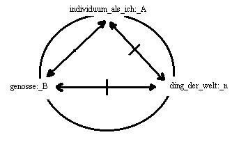 die relation: individuum_als_ich<==>genosse, ist für sich das analytisch darstellbare minimum. Mit jedem ding der welt ist als drittem moment ein schema im trialektischen modus beschreibbar, das in der vielzahl der möglichen weltdinge die denkbare komplexität der welt fixiert. <==//
