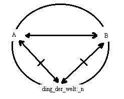 die figur des beobachtenden dritten: C, wird in dem schema nicht thematisiert. Das würde die sache weiter komplizieren, weil der beobachtende dritte: C, sowohl als der neutrale beobachter erscheint, der eine bestimmte fallkonstellation als moment seiner relation setzt, die eine neues schema im trialektischen modus generiert, als auch als der neutrale beobachter: C, der in unmittelbarer kommunikation mit A und B in wechselseitigen relationen verknüpft sein kann. Das wäre ein weiterer fall. <==//