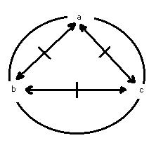 Gleich der dialektik konstituieren drei momente den trialektischen modus. Unter ausschluss des jeweils dritten moments sind zwei momente abhängig relationiert. Die drei momente, in der abstrakten form mit den buchstaben: "a, b und c", bezeichnet, sind gleichrangig; keinem moment kann im schema ein vorrang zugeordnet sein und das schema ist gegenstandslos, wenn ein moment herausgestrichen, oder, das ist ein anderes schema, wenn ein viertes moment: d, hinzugefügt würde. Die drei momente: "a, b und c" sind in drei möglichen relationen miteinander abhängig relationiert: a<==|==>b, b<==|==>c und c<==|==>a. Diese relationen sind, einer alten tradition folgend, figurativ in einem dreieck geordnet, dessen eckpunkte zugleich als punkte auf der zugehörigen kreislinie interpretiert werden (//==>materialien: 4.1). Eine relation ist dann bestimmt, wenn sie im horizont des ausgeschlossenen dritten moments fixiert ist. Die relation: a<==|==>b, ist bestimmt im horizont des ausgeschlossenen dritten moments: c, die relation: a<==|==>c, ist bestimmt im horizont des ausgeschlossenen dritten moments: b, und die relation: b<==|==>c, ist bestimmt im horizont des ausgeschlossenen dritten moments: a, (//==>materialien: 4.2). Was in der relation: a<==|==>b, kategorisch bestimmt ist, das erscheint im horizont des ausgeschlossenen dritten moments: c, latent suspensiert, weil die momente: a und b, jedes für sich, mit dem moment: c, im horizont des jeweils ausgeschlossenen dritten moments: b oder a, relationiert sind. In dieser latenz ist die linearität des dialektischen prozesses in seiner ungleichzeitigkeit der konstitutiven momente in der gleichzeitigkeit der zirkularität im trialektischen modus ebenso aufgehoben wie die gleichzeitigkeit der zirkularität des trialektischen modus in der ungleichzeitigkeit der konstitutiven momente in der linearität des dialektischen prozesses präsent ist.