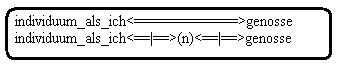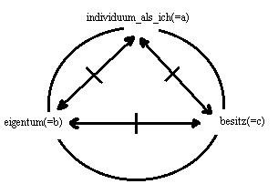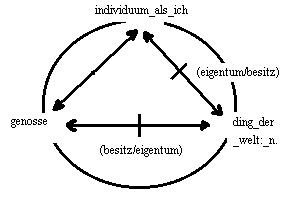 perspektive der dialektik. Mit der setzung, nicht begründbar, wird das schema des trialektischen modus mit fakten angefüllt, die das schema in seiner struktur einerseits nicht verändern, andererseits aber das schema mit komplexität anfüllen können.In raum und zeit sind die mit dem buchstaben: "a, b und c" bezeichneten momente dinge der welt. Anderes als diese dinge der welt sind für das individuum als ich nicht möglich, wenn es seine welt denkt, sich selbst als ding seiner welt einschliessend. Es ist daher nur eine konvention, wenn Ich im schema das mit dem buchstaben: a, bezeichnete moment, durch den terminus: das individuum als ich, ersetze, das mit dieser setzung quasi angelpunkt seiner welt ist, ohne dass mit dieser setzung dem individuum als ich, ein ding der welt, ein vorrang im schema eingeräumt sein kann. Die mit den buchstaben: b und c, bezeichneten momente, können mit jedem anderen denkbaren weltding besetzt werden, einsetzungen, die, gleichfalls einer konvention folgend, nach der dichotomie: das allgemeine/das besondere, geordnet sein können. Für die weiteren überlegungen gelten die momente: "das individuum als ich(=a), das eigentum(=b) und der besitz(=c)" (//==>materialien: 4.3). Das individuum, das ein ich ist, kann ohne seinen genossen, der, wie es selbst, ein ich ist, nicht existieren. Mit dieser feststellung ist die komplexität im schema erweitert. Die relation, die das individuum als ich zu den dingen der welt, soweit diese das_andere sind, nur als abhängige relation setzen kann, ist eine wechselseitige relation, wenn das individuum als ich seine relation zum genossen setzt, so, wie der genosse seine relation zum individuum als ich setzen wird; denn beide, der genosse und das individuum als ich, dinge der welt, sind zueinander nicht das_andere, sondern der_andere. In der relation: indivividuum_als_ich<==>genossen, erscheint das ding der welt: n, vom individuum als ich oder seinem genosse als ihr jeweiliges eigentum geschaffen, das entweder vom individuum als ich oder vom genossen besessen wird, nicht als konstitutives moment ihrer relationen, gleichwohl ist ihnen das ding der welt: n, als das ausgeschlossene dritte moment im schema des trialektischen modus präsent (//==>materialien: 4.4). Das ding der welt: n, identisch mit sich selbst, kann sowohl für den genossen als auch für das individuum als ich in zwei relationen zur hand sein, einerseits als ihr jeweiliges eigentum, andererseits als ihren besitz, den anderen jeweils davon ausschliessend, gleichgültig, ob behauptet oder nicht.