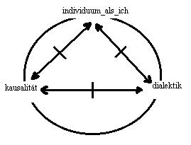 (a) die darstellung in der graphik mag assoziationen zum sogenannten wesen eines dreiecks oder eines kreises evozieren, beliebte thesen in der esoterik, aber diese verknüpfungen haben mit dem schema: im trialektischen modus, nichts gemein und können als phantastereien getrost beiseitegelegt werden. Weder dem dreieck noch dem kreis kann ein metaphysischer sinn abgepresst werden, aber die geometrischen formen werden als hilfsmittel genutzt, komplexe strukturen auf überschaubare modelle in raum und zeit zu reduzieren. In diesem sinn ist die wiederholung des gedankens in der graphischen darstellung eine methode im metaphysischen denken. (a)<==//(b) als beispiel einer komplexen graphik das schema mit dem individuum als ich im mittelpunkt der methoden: "kausalität, dialektik und trialektik. //==>argument: 2.4.017, graphik: 06d. (b)<==//