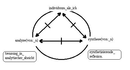 (b) den gedanken mit einer graphik wiederholt. Das schema, die erkenntnis eines bestimmten weltdinges: n, weist drei elemente auf. Das erste element ist das individuum als ich, das das bestimmte weltding: n, erkennen will, indem es dieses analysiert und das resultat der analyse in einer synthese zusammenfasst. Das zweite element ist folglich die analyse(von:_n) und das dritte element die synthese(von:_n)(01).