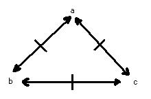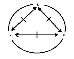 der gedanke in einer graphik wiederholt. Das dreieck und der kreis sind formen der graphischen darstellung, die dem grundschema des trialektischen modus kein neues merkmal hinzufügen(a).2.4.003Die momente: "a, b und c" sind in den relationen: "a<==|==>b, a<==|==>c, b<==|==>c" miteinander verknüpft.