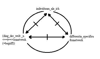 ---(a) die frage soll ausgeklammert bleiben, ob es über bestimmte dinge der welt noch einen streit geben könnte, zum beispiel ob das bild, die Mona Lisa von Leonardo da Vinci, ein kunstwerk sei oder ein in seinem wert maasslos überschätztes stück alter leinwand mit farbklecksen drauf. Es gibt einen allgemeinen konsens, über generationen stabil, dass es dinge der welt gibt, die als kunstwerke gelten. Der grund der geltung ist im individuum als ich und seinem genossen verortet, nicht im objekt. Wäre es anders, dann könnte nicht erklärt werden, warum ein bild von der einen generation hoch geschätzt wurde, das die nachfolgenden generation aber ins depot verbannte, oder, als gegenbeispiel, das bild, das zur lebenszeit seines schöpfers von der kritik verrissen wurde, die nachlebende generation aber zu einem schlüsselwerk der epoche erklärte. (a)<==//(b) der gedanke in einer graphik wiederholt. Die momente im schema sind: "das individuum als ich, die relation: (ding_der_welt:_n<==|==>kunstwerk(=begriff))(01) und die differentia specifica für den begriff: kunstwerk",(01).