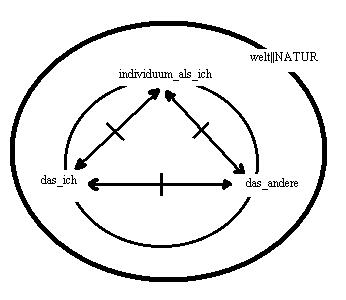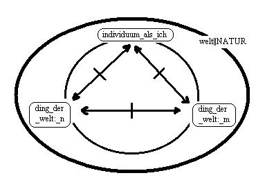 (a)der graphik ist das zeichen für die welt hinzugefügt.(b)es ist nicht zulässig, den terminus: individuum als ich, auf den terminus: individuum, zu verkürzen. Das sind zwei unterscheidbare zeichen, die jeweils anderes bezeichnen, einen begriff oder ein phänomen - tertium non datur.(2.4.010/(d/01))<==//