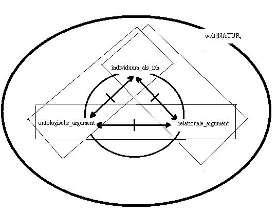 der gedanke im argument: 2.3.001/(f), in einer graphik wiederholt. Die momente sind: "das individuum als ich, das ontologische argument und das relationale argument". Im moment der gelebten gegenwart kann das individuum als ich entweder das ontologische argument in einer relation fassen oder das relationale argument - tertium non datur. In der logik des trialektischen modus sind nur drei konstellationen möglich, die jeweils das dritte moment als das ausgeschlossene moment zum bestimmenden moment der relation haben(a).2.6.011