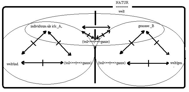 Es sind mithin zwei schemata(a), gleich, aber nicht identisch, die in der relation: teil<==|==>ganze, ihr verknüpfendes moment haben. Die relation: teil<==||==>ganze, hat das individuum als ich: A, und sein genosse: B, im horizont des ausgeschlossenen dritten moments, ihres begriffs von welt, präsent.schema: 2