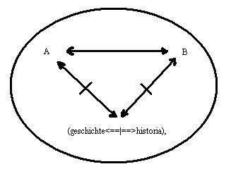 graphik: 02adie dialektik von geschichte und historia ist dann offenkundig, wenn die relation: geschichte<==|==>historia, der gegenstand ist, den das indviduum als ich: A, und sein genosse: B, im blick haben, wenn sie über ein dokument der historia streiten. Das grundschema ist: