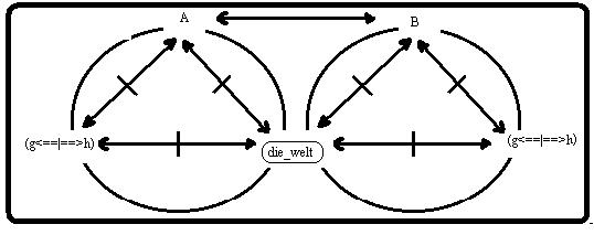 (01)die graphische darstellung dieser situation wird nicht versucht, weil mit dem grad der komplexität auch die unmittelbare aussage einer graphik relativiert wird. (g)<==//in der analyse ist das dritte schema mit dem moment: welt(A oder B), so darstellbar.(i)
