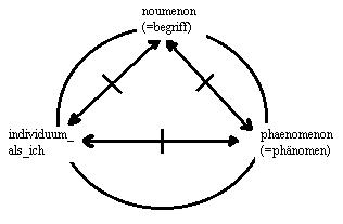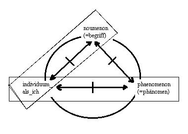 Mit einem rechteck sind die situationen markiert, wenn das individuum als ich einerseits einen begriff(=noumenon) denkt, den es in seiner vorstellung im forum internum immer im horizont des korrespondierenden phänomens(=phaenomenon) als dieses und nicht jenes präsent hat, oder andererseits das phänomen(=phaenomenon) wahrnimmt, für das es in seinem forum internum den adäquaten begriff(=noumenon) als das ausgeschlossene dritte moment präsent hat.