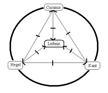 Die verbindungslinien zwischen den namen: "Cusanus, Leibniz, Kant und Hegel", gleich dem zeichen für die abhängige relation, markieren keine relationen. Es ist ausgeschlossen, das bild, komponiert mit den vier elementen, als schema im trialektischen modus zu interpretieren. Das ist anders, wenn dem bild weitere annahmen hinzugefügt werden, so die figur des beobachters, der die dokumente der historia zusammengetragen hat, jedes dokument mit einem etikett versehen, auf dem die namen der genannten personen verzeichnet sind. Diese ergänzungen sind hilfskonstruktionen, die das bild, plausibel in seiner reduktion, so komplex erscheinen lassen, dass die beabsichtigte wirkung, mit dem bild einen sachverhalt zu klären, verfehlt wird. (b)<==//denkbar ist, im bild die erforderliche identität der nabe des rades mit einem kunstgriff zu konstruieren(01), aber das resultat wird nicht überzeugen. D'accord, für sich waren die benannten personen mit sich selbst identisch gewesen, aber das, was sie für sich gewesen waren, das können sie für den jeweils anderen in historia und geschichte nicht sein. Gottfried Wilhelm Leibniz, der_andere, war als individuum, das ein ich gewesen war, mit sich identisch, aber die wechselseitige relation: Leibniz<==>Hegel, pars pro toto als hypothese denkbar, hatte in raum und zeit nicht bestanden und jede behauptete relation, eine beziehung zwischen Hegel und Leibniz statuierend, ist für das behauptende individuum als ich nur in der form einer abhängigen relation real(02). Es ist eine andere konstellation, wenn der begriff: ideologie, sedimentiert in einem dokument der historia, als moment einer relation gesetzt ist. Dieses moment ist für das setzende individuum als ich mit sich identisch, fixiert in der relation: individuum_als_ich<==|==>ideologie.