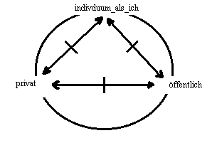 die logik dieses zusammenhangs(01) ist im trialektischen modus präzis darstellbar(02). Die momente sind: "das individuum_als_ich, privat und öffentlich",. Die relationen, vom individuum als ich gesetzt, sind im horizont des jeweils ausgeschlossenen dritten moments bestimmt.