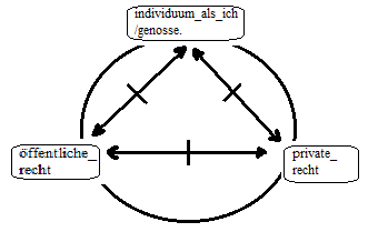 In der graphik: 03, sind zwei schemata zusammengefasst, die nicht identisch fallen können, zum ersten das schema: das individuum als ich, zum zweiten das schema: der genosse. Die situation präsentiert sich als komplex, wenn die wechselseitige relation: individuum_als_ich<==>genosse, in die betrachtung einbezogen wird und die relation: öffentliche_recht<==|==>private_recht, der gemeinsame gegenstand ist.