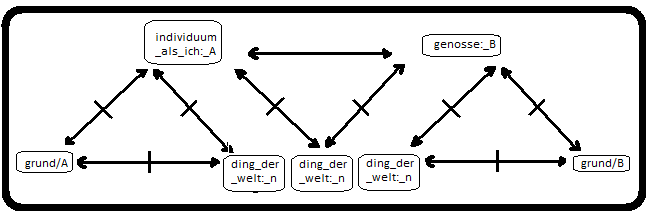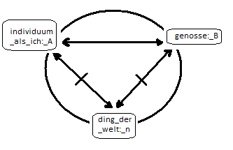 1.rel.: individuum_als_ich:_A/genosse:_B<==|==>ding_der_welt:_n,