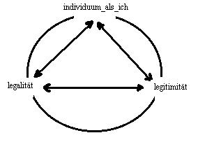 (b) der begriff: anerkennung, in der jurisprudenz ist anders definiert und bleibt unberührt. (text)<==//die in einer behauptung implizierte gleichsetzung von legalität und legitimität ist falsch. Legitimität und legalität sind nicht miteinander austauschbar, aber es wird in der gesellschaftlichen praxis die illusion gepflegt, geleitet von einem interese, dass die termini: "legal und legitim, die verneinungen eingeschlossen"(a), al gusto miteinander austauschbar sind; denn das, was legal ist, das kann illegitim sein, und das, was illegitim ist, kann legal werden(b). Als phänomen ist der widerspruch in den begriffen ein gegensatz, der schmerzlich geläufig ist. Alle, die es betrifft, sind in den gegensätzen eingebunden und keiner kann sich diesen implikation entziehen. Darstellbar ist das problem mit dem schema des trialektischen modus. Das individuum als ich muss sowohl mit der legalität des gesetzes kalkulieren als auch mit seiner legitimität. Die relation: legalität<==|==>legitimität, ist das problem. Die legalität des gesetzes hat das individuum als ich präsent nur im horizont der legitimität, die das ausgeschlossene dritte moment ist. Die legitimität des gesetzes hat das individuum als ich nur im horizont der legalität des gesetzes präsent, das das ausgeschlossene dritte moment ist. Die dritte relation, das problem, ist nur bestimmt im individuum als ich, das das ausgeschlossene dritte moment ist. Die zureichende antwort über das, was die legalität und die legitimität für sich sind, ist nur im horizont des dritten moments möglich, und das ist das individuum als ich, das sich entscheiden muss.2.09Die momente: individuum als ich, legalität und legitimität.