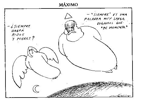 auch das bild kann als zitat instrumentalisiert werden. Hier ist der fall einfach gestaltet, und, weil dass bild und der text miteinander konkurrieren, kann es offen bleiben, ob der autor seinen akzent auf die information des bildes oder des textes legen wollte; in der wahl seines akzentes ist der rezipient frei. Ich interpretiere die karikaturen Maximo's eher aus den beigefügten texten und weniger aus den bildern, die bestimmte situationen oft stereotyp darstellen(2).