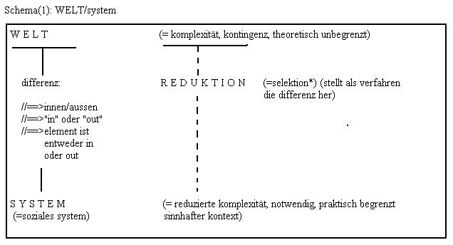 wiederholung des gedankens: 2.22.45/(b/2). Luhmann's begriff: reduktion von komplexität, ist in zwei schemata darstellbar. Das schema(1) hat die differenz: welt/system, zum gegenstand. Der gegenstand des schema(2) ist das verfahren der reduktion von komplexität, von Luhmann mit dem terminus: selektion, gekennzeichnet.2.24.19