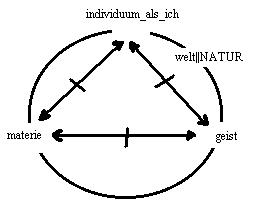 *** nur mit einer einfachen verbindungslinie angedeutet. <==//Die relationen: nummer 4 bis 6, konstituieren als relation(1) jeweils ein eignes schema, dessen drittes moment vom individuum als ich und dem beobachtenden dritten in der relation(2) erfasst wird, wobei das dritte moment, zum beispiel der begriff: welt, für das individuum als ich und für den beobachtenden dritten als identisch erscheinen können, niemals aber identisch sind. Die möglichen schemata: schema 2 bis 4, sind in keinem fall identisch, gleichwohl ähnlich.