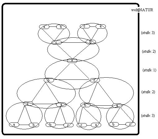 (1) um die komplexität der graphik nicht zu erhöhen erscheint die abhängige relation: <==|==>, als einfacher strich, die momente der relationen werden nur einfach mit den buchstaben: "a, b und c" gekennzeichnet, die verschiedene dinge der welt repräsentieren. An der seite ausserhalb der schemata sind die stufen der analyse: 1 bis 3, notiert. Der schmale strich markiert die schemata des trialektischen modus, der starke strich die absolute grenze: welt||NATUR.Die relationen im schema 1: