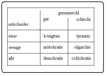 (a)es könnte gefragt werden, warum Ich mich so gewunden ausdrücke, und die frage wird mit gutem grund gestellt, mein grund aber ist simpel. Wenn in einem diskurs der staat als gegenstand des diskurses erscheint und wenn bei dieser gelegenheit auch auf die meinung des Aristoteles bezug genommen wird, dann wird es nicht vermeidbar sein, das berühmte schema zu zitieren. Es ist eine frage der praxis, wenn der kerngedanke des schema in dieser konstellation der dinge paraphrasierend wiederholt wird. Ob dem kerngedanken in seiner wiederholung noch etwas neues hinzugefügt werden kann oder hinzugefügt werden soll, das ist eine frage der perspektive, also eine meinung, der andere meinungen beigesellt sein können. Mit diesem obiter dictum werde Ich diesen aspekt beiseite stellen. (a)<==//(b)der rezipient meines arguments wird, für sich selbst gültig, entscheiden, ob meine reflexionen über Aristoteles der sache neue perspektiven geöffnet haben. (b)<==//(c)das schema des Aristoteles wiederhole Ich in einer tabelle, die Ich als angemessene darstellung seiner erläuterungen ansehe(01). Die totalität aller denkbaren staatsformen(02) erfasst Aristoteles mit zwei kriterien, die er noch einmal unterscheidet. Zweigeteilt ist das eine kriterium, das andere dreigeteilt. Folglich kann es nur sechs formen der staatlichen organisation geben. Das erste kriterium ist das gemeine wohl aller, das entweder erreicht wird(=gut), oder verfehlt ist(=schlecht). Das zweite kriterium ist auf die zahl derjenigen begrenzt, die befugt sind über die dinge des staats zu entscheiden, die alle betreffen; das können sein, entweder einer(=könig), oder wenige(=die besten) oder alle(=das volk). In der tabelle sind die möglichen staatsformen in der terminologie des Aristoteles zusammengefasst(03).(d)