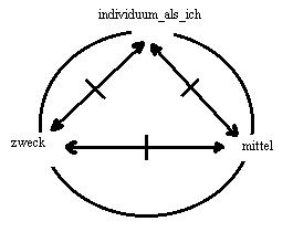 (a)wenn die unterscheidung: begriff/terminus, strikt beachtet wird, dann ist es auch zulässig, den terminus: zweck, äquivalent mit dem terminus: interesse, auszutauschen(01). Die autonomie, die das individuum als ich für sich behauptet, wenn es ein ding der welt seinem zweck unterstellt, kann vom genossen ebenso behauptet werden, wenn dieser dasselbige weltding seinem zweck unterstellt. Das mit sich identische ding_der_welt:_n, kein konstituierendes moment in der relation seiend, hat in der wechselseitigen relation: individuum_als_ich<==>genosse, die funktion eines vermittelnden moments. Die teilrelationen: individuum_als_ich<==|==>ding_der_welt:_n und genosse<==|==>ding_der_welt:_n, werden äquivalent auch in der formel:(b)
