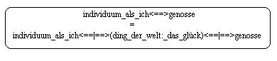 es ist ein irrtum, wenn der sogenannte reiche meint, er könne im ausleben seines reichtums als formen des glückes den armen vergessen - er kann in seinem bewusstsein den armen verdrängen, aber nicht auslöschen.der gedanke in einer graphik wiederholt. Die wechselseitige relation zwischen dem individuum als ich und seinem genossen ist auch dann real, wenn in der vermittlung durch das glück des einen oder des anderen das ding der welt: das glück, von beiden mit abhängigen relationen erfasst wird. Die relation: individuum_als_ich<==>genosse, ist äquivalent mit der relation: individuum_als_ich<==|==>(ding_der_welt:_das_glück)<==|==>genosse,(*1).(03)