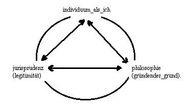 Die momente sindzum ersten das individuum als ich, das einerseits die juristische frage in der relation: individuum_als_ich<==|==>jurisprudenz, setzt und das andererseits die philosophische frage proponiert mit der relation: individuum_als_ich<==|==>philosophie,Damit ist die dritte relation gesetzt: jurisprudenz<==|==>philosophie.zum zweiten und dritten die momente: jurisprudenz(a) und philosophie.